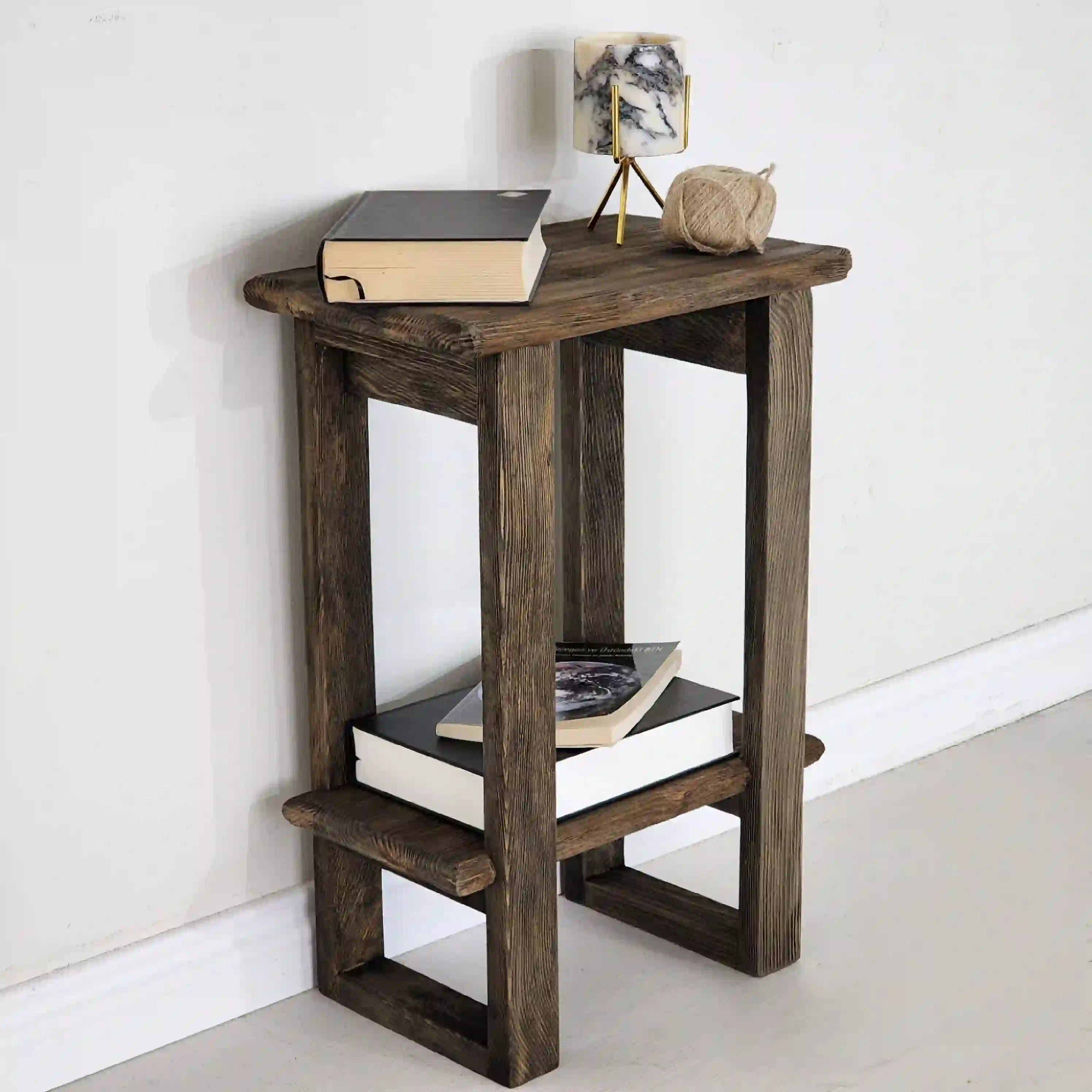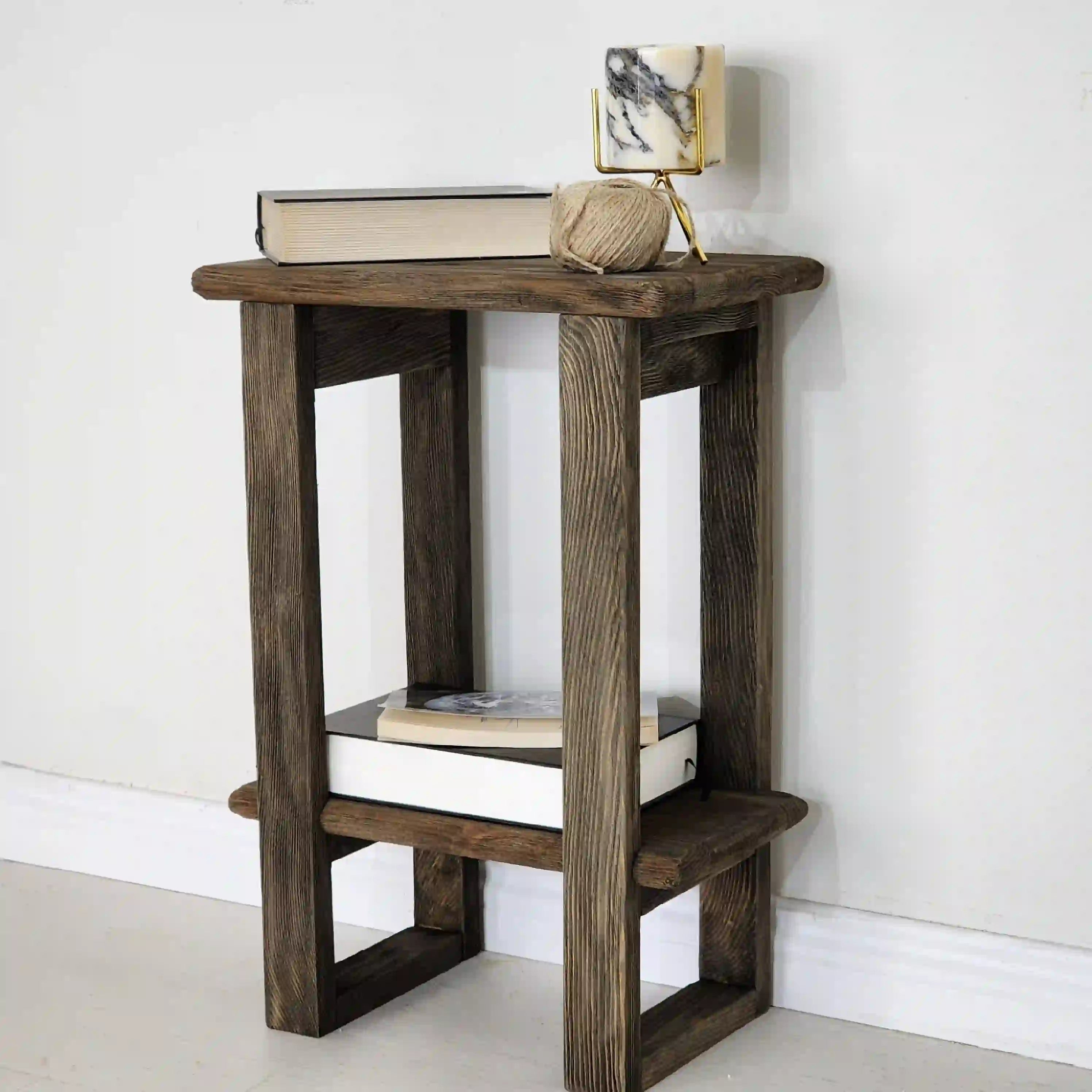 Solide Altholzkonstruktion Die Möbel werden aus massivem Altholz gefertigt, das von Harthölzern wie Kastanie, Kiefer, Tanne, Eiche und Zeder stammt. Diese Konstruktion aus wiederverwertetem Holz macht die Tische langlebig und trägt zu ihrem warmen, gealterten Charakter bei.